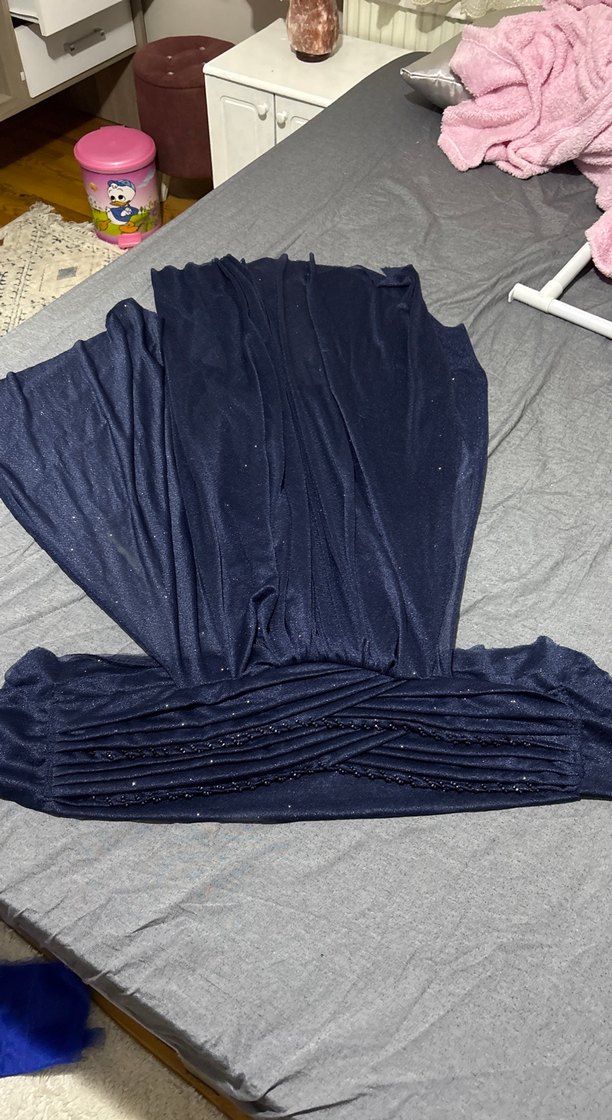 Lacivert renkte, straplez ve drapeli uzun abiye elbise. Sade desensiz, vücuda oturan kesimiyle gece partileri için uygundur. Goth ve avant-garde tarzlara uyum sağlar. Şal