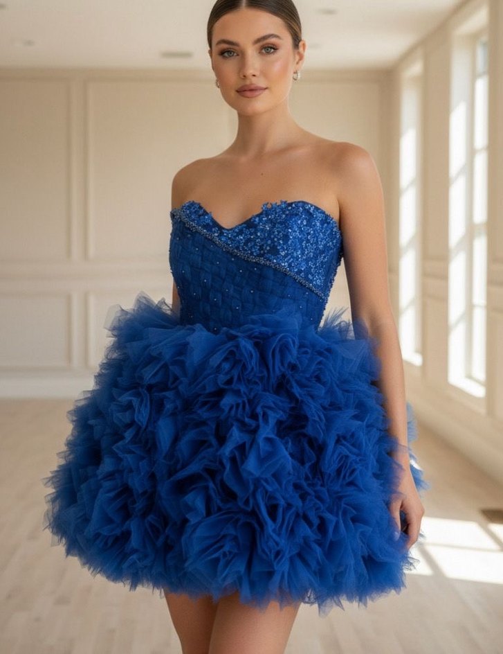 Mavi straplez mini abiye elbise, payetli dar üst kısmı ve hacimli fırfırlı etek detayıyla cesur parti stilleri için uygundur. ✨