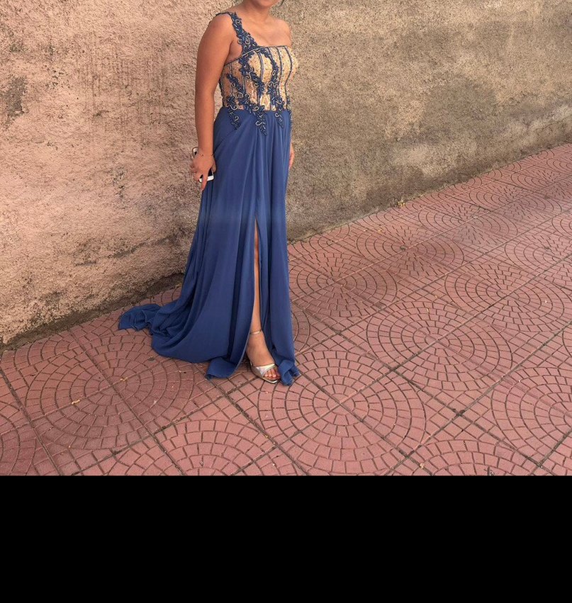 Straplez uzun abiye elbise, dantel detaylı oturan üst kısmı ve ön yırtmaçlı akışkan drapeli etek kısmıyla düğün ve özel davetler için uygundur.