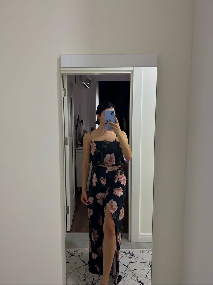 Straplez yaka ve ince askılı, vücuda oturan midi elbise. Sentetik kumaş, koyu renk tie-dye desenli, şeffaf detaylı ve ön yırtmaçlı. Romantik gece için uygun.