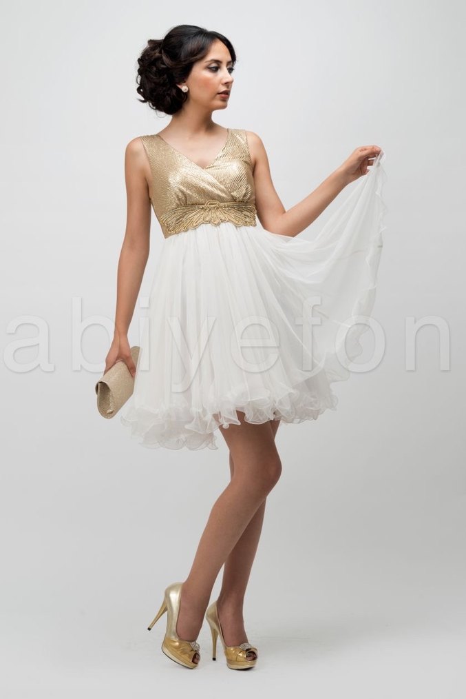 Altın renkli drapeli üst kısmı ve hafif beyaz desenli eteğiyle straplez mini abiye elbise, düğünler için uygun.
