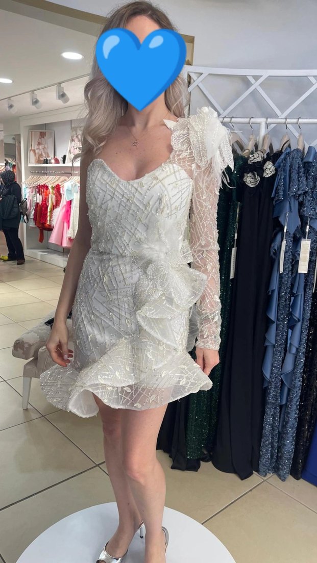 Bu beyaz mini gelinlik, straplez yaka ve detaylı tek kollu tasarımıyla avant-garde ve bohem tarzı yansıtıyor. ✨