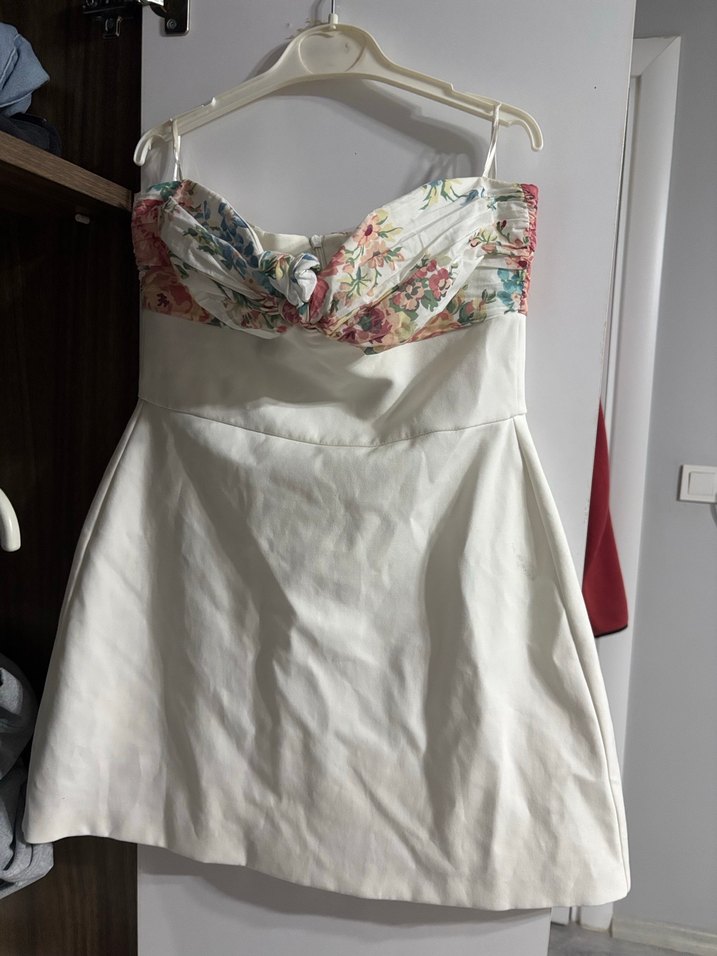 Bu straplez, mini gelinlik, beyaz etek ve çiçek desenli bustiyer ile vintage ve bohem tarzları birleştirir.