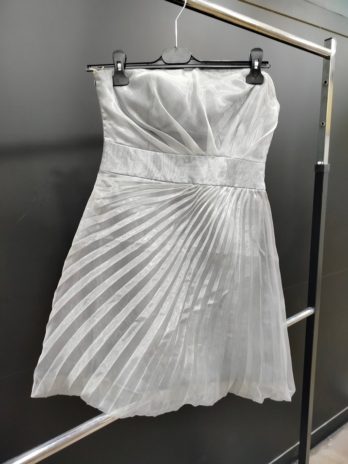 Straplez yaka ve kolsuz, vücuda oturan mini elbise. Katlamalı etek ve gri-beyaz tonları ile çağdaş tarzda, modaya uygun avant-garde tasarım.organize tül detaylı