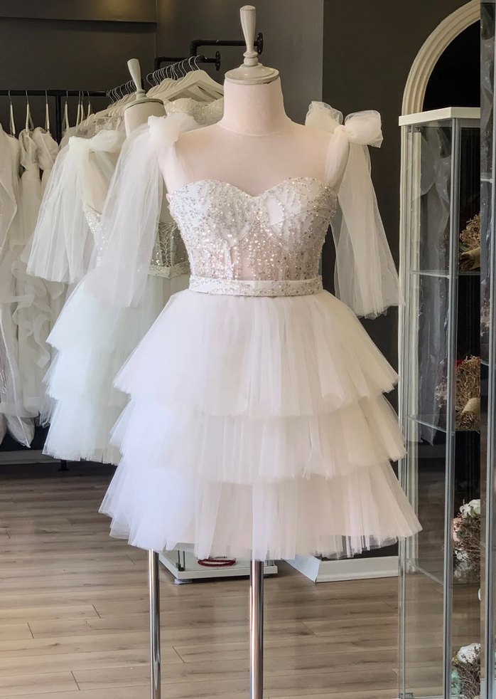 Beyaz straplez mini gelinlik, işlemeli dar gövde ve şeffaf askılı kollarla tasarlanmıştır. Kat kat tül etek modern klasik bir görünüm sunar.