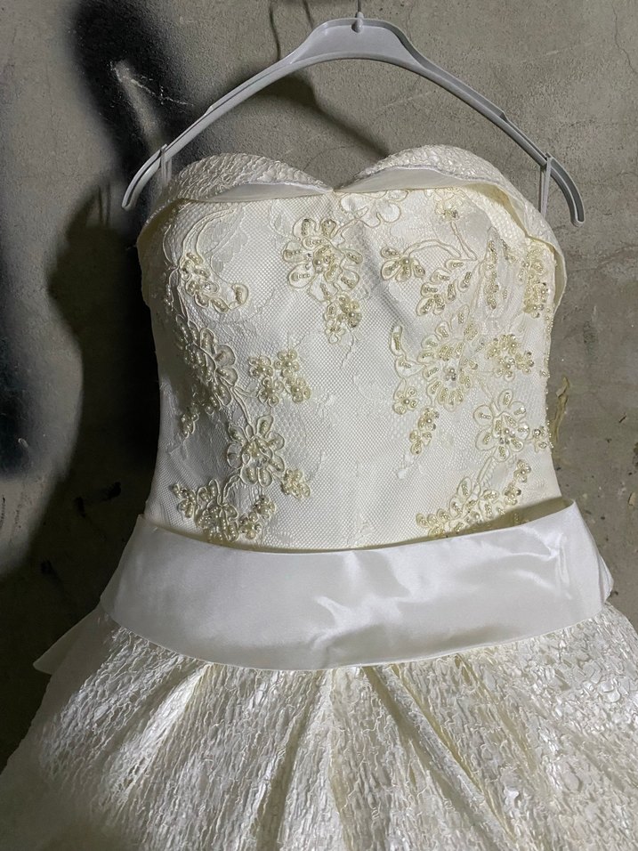Beyaz straplez mini gelinlik, çiçekli dantel işlemeli oturan üst kısmı ve ince askılarıyla vintage tarzı yansıtır. Saten kemer detayı ve kısa boyu ile klasik şıklık sunar.