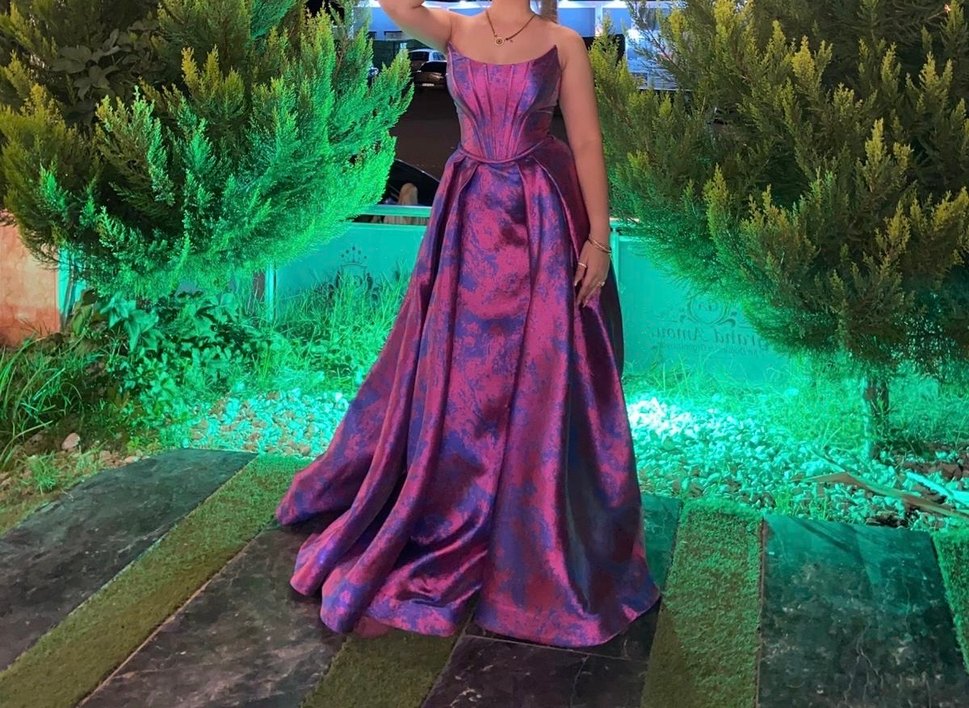 Straplez, uzun, dökümlü ve bol kesim mor abiye elbise, koyu tonlarda batik desenli, özel davetler için uygun.