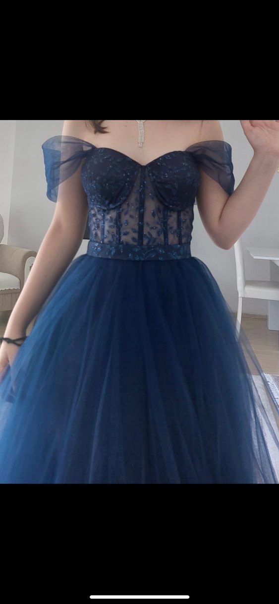 Straplez yakalı, nakışlı dantel detaylı lacivert abiye. Klasik ve gotik tarzı birleştiren, normal boy, kolsuz ve vücuda oturan model.
