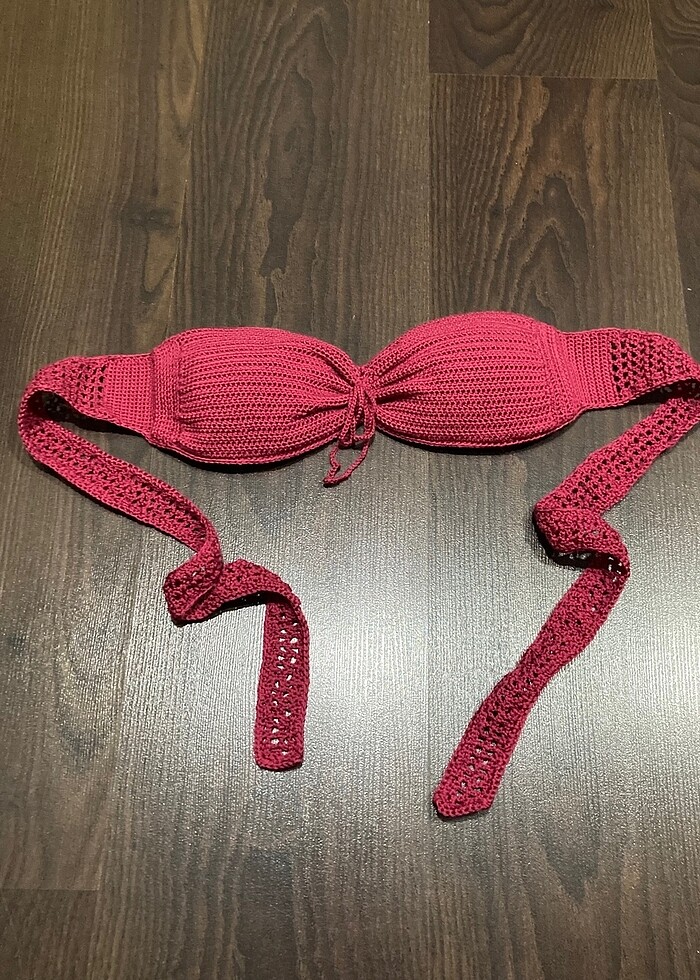 Yeni örülmüştür, straplezdir, isteğe göre askı eklenebilir. Üstte, gömlek ve transparan bluz içinde tatlı bir duruşu var.