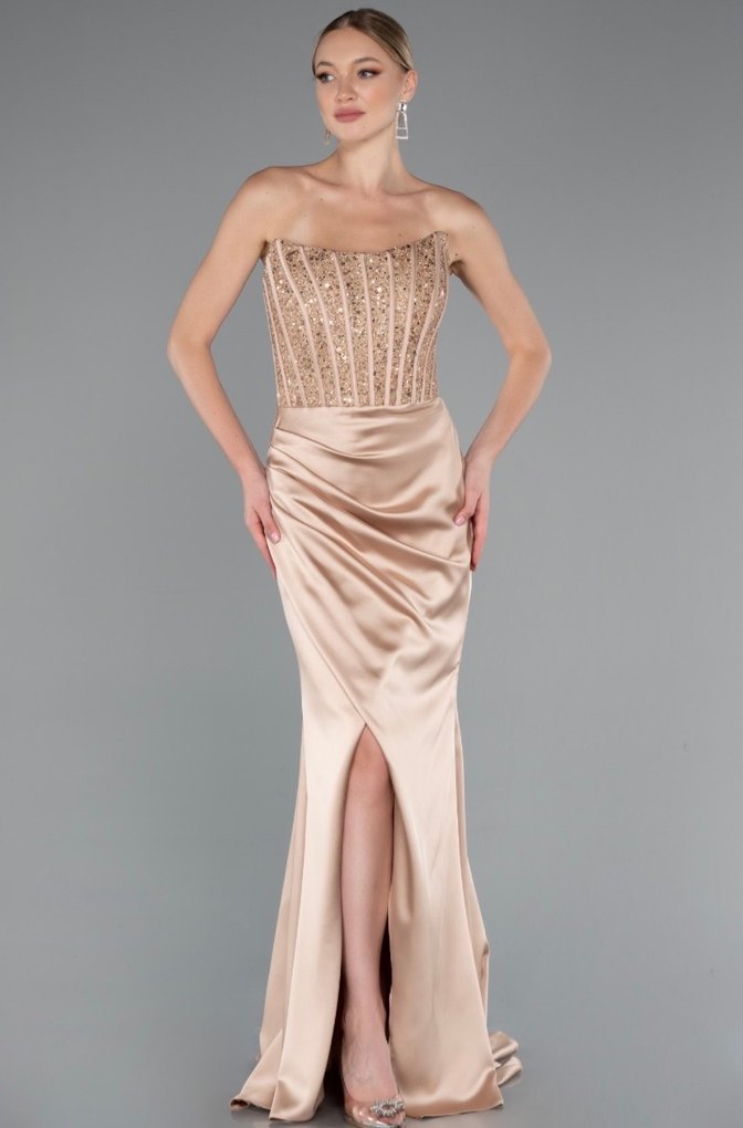 Straplez, drapeli ve parlak bej kumaştan uzun ve vücuda oturan abiye elbise. Düğün ve özel davetler için uygundur. ✨ 36-38-40 bedene uyumludur Arkası ipli