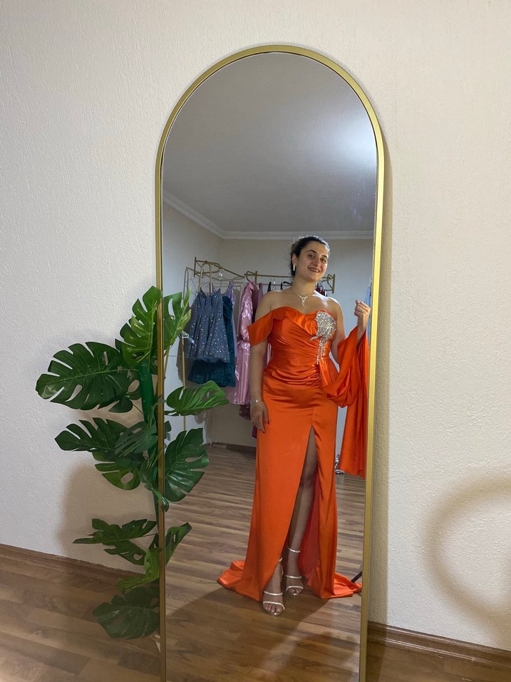 Parlak turuncu renkte, straplez uzun abiye elbise. Drapeli tasarım, baskılı desen ve ince askılı kollara sahip. Düğünler için şık ve modern bir seçim. 38/40