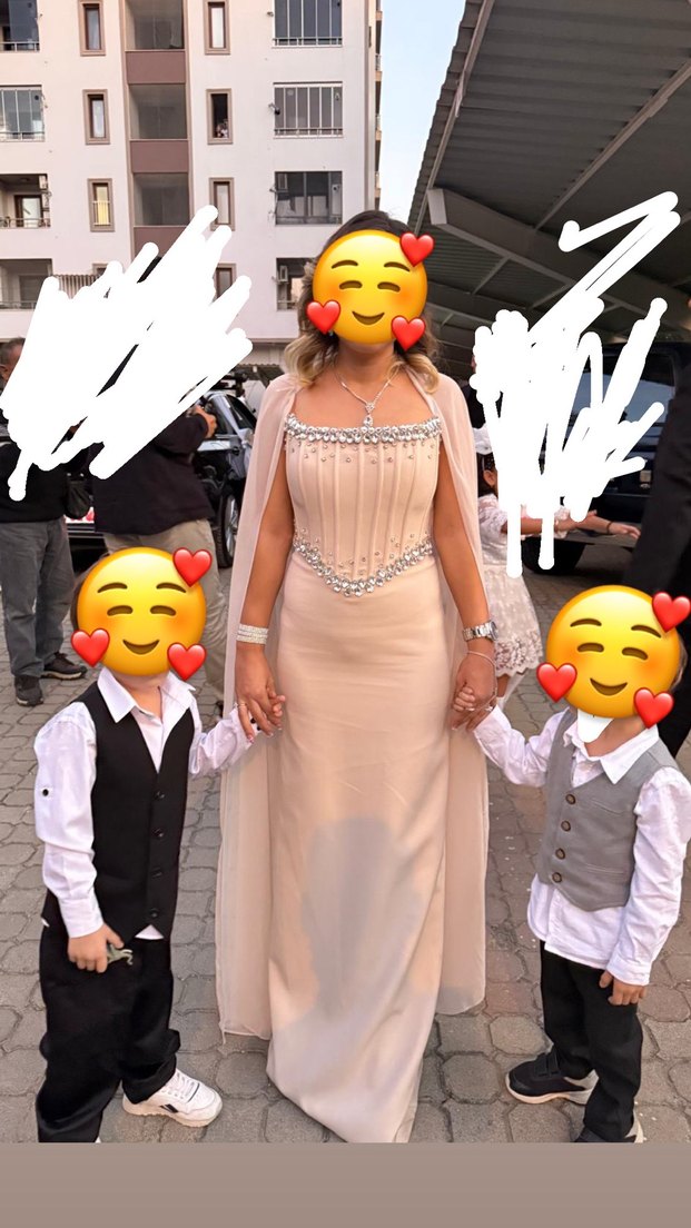 Uzun, straplez, payet detaylı açık altın rengi abiye elbise. Kolsuz ve etnik desenlerle süslenmiş, klasik şıklık sunar. Düğünler için uygun. ✨