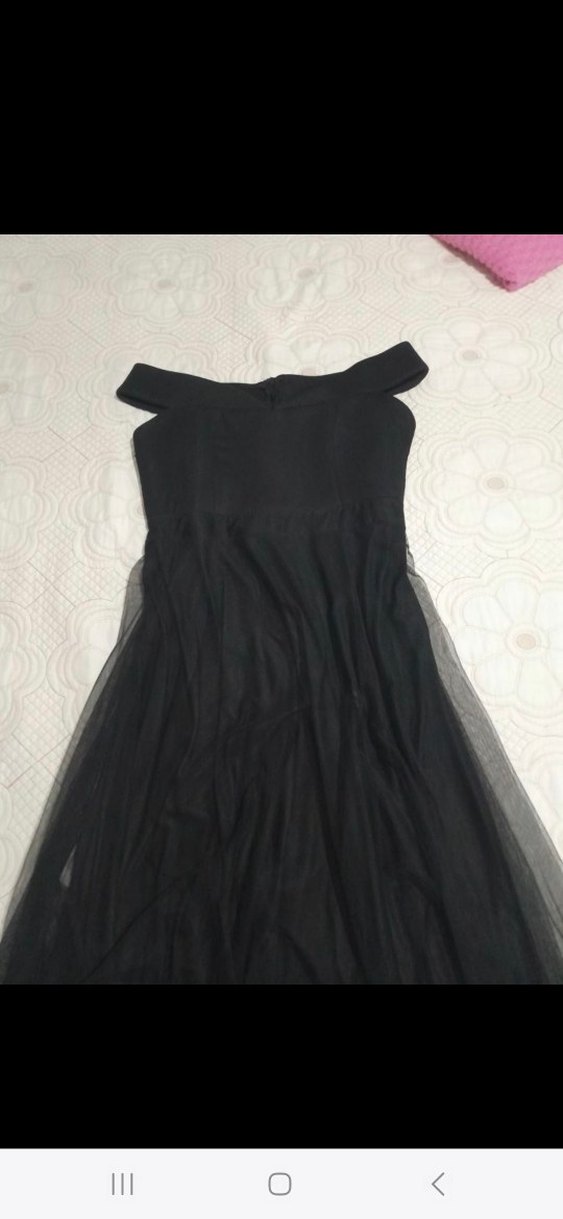 Straplez, siyah, uzun ve drapeli tasarıma sahip, kolsuz ve vücuda oturan sentetik kumaş elbise. Gotik ve avangart tarzda, düğünler için uygun. marka temsili