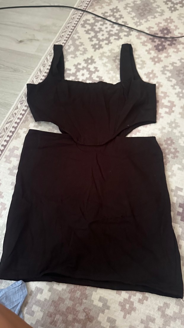 Siyah, straplez midi boy, dar kesim elbise, yırtmaç detaylı ve sentetik kumaştan. Cesur, gotik romantik gece için uygundur.