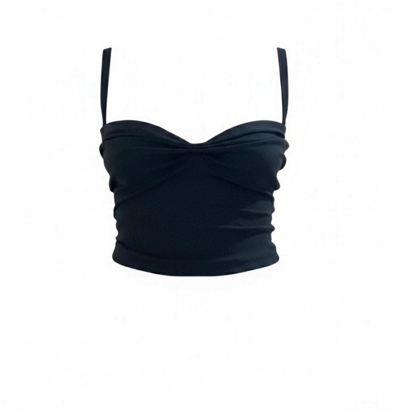Siyah renkli, pile detaylı ve ince askılı straplez mini bustiyer. Sentetik kumaştan, minimalist gotik tarzda, vücuda oturan kesim.