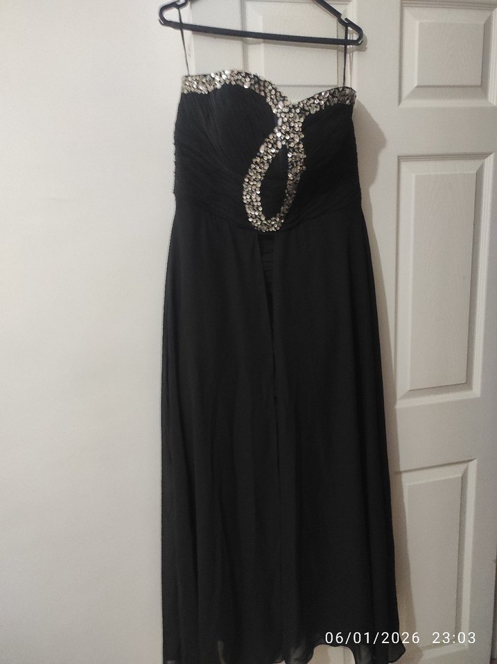 Bu siyah uzun abiye elbise straplez ve dökümlü detaylara sahiptir. Kolsuz, klasik ve gösterişli goth tarzıyla düğünler için uygundur. ✨
