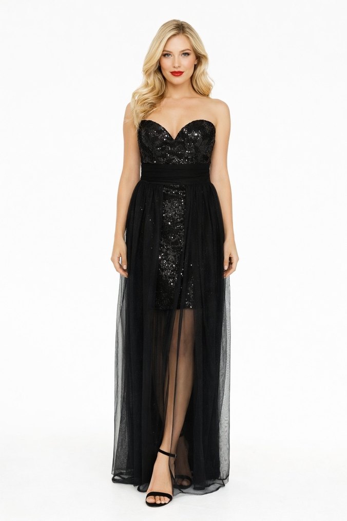 Straplez Siyah Uzun Abiye Elbise Payetli pullu tül