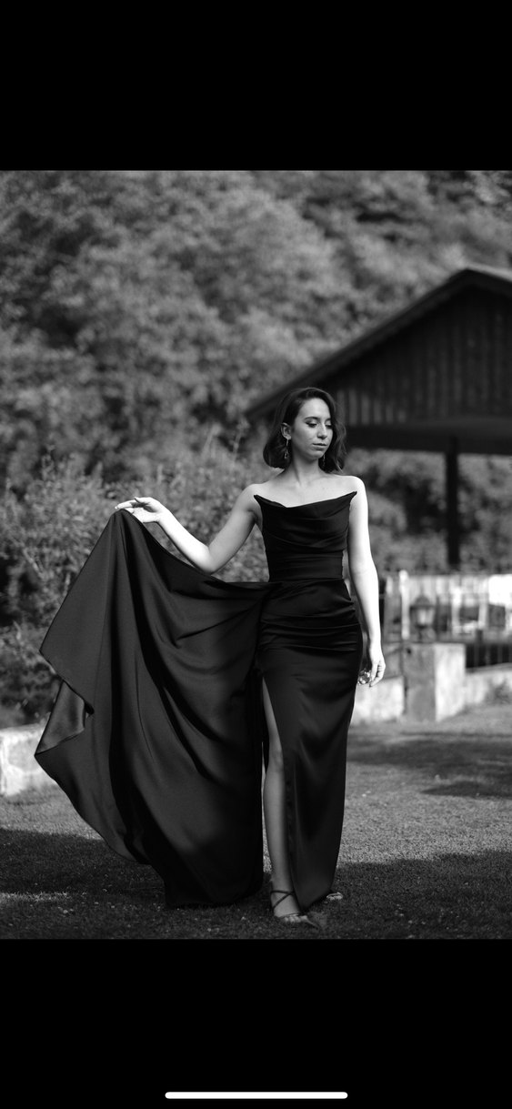 Bu siyah, straplez, dar kesim abiye elbise drapeli tasarımı ve ince askıları ile uzun boydadır. düğünler için uygundur.