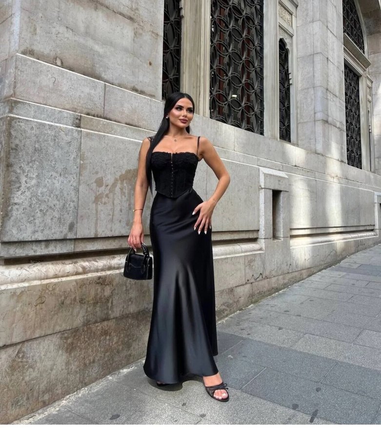 Saten kumaştan, straplez ve ince askılı, drapeli siyah uzun etek, romantik akşamlar için ideal.