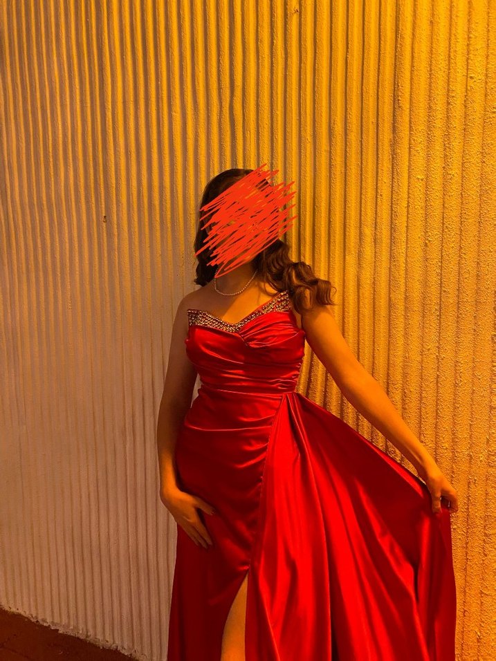 Parlak kırmızı saten kumaştan, askılı ve drapeli, uzun ve vücuda oturan abiye elbise. Cesur parti tarzları için uygun, yırtmaçlı tasarım. ✨❤️