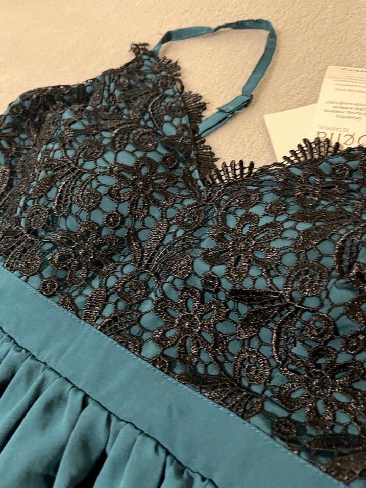 Straplez, siyah dantel işlemeli üst kısmı ve dökümlü koyu turkuaz etek kısmıyla, loose fit uzun abiye elbise. Düğünler için uygun.Askısında ufak bir sıkıntı var pazarlığa açık