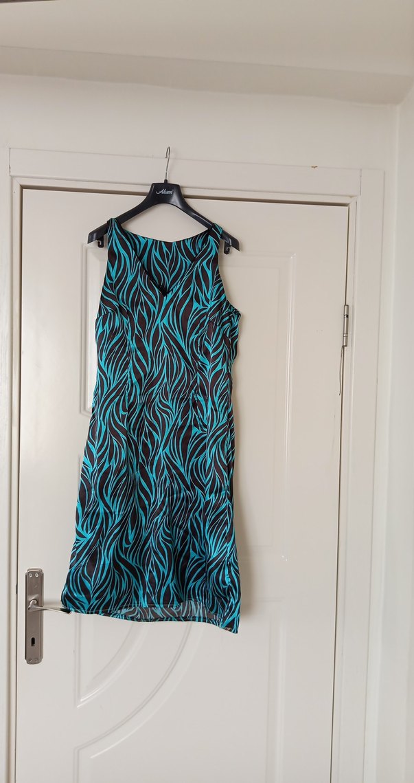 Kolsuz, turkuaz zebra desenli uzun elbise. Oturan kesimi ve pile detaylarıyla çağdaş bohem tarzını yansıtıyor.