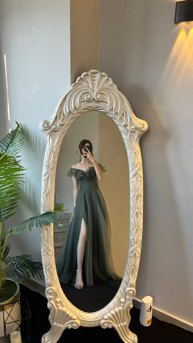 Şeffaf detaylı, straplez yakalı ve uzun kesimli bu abiye, kolsuz ve koyu haki renktedir. Klasik zarafet için uygundur.