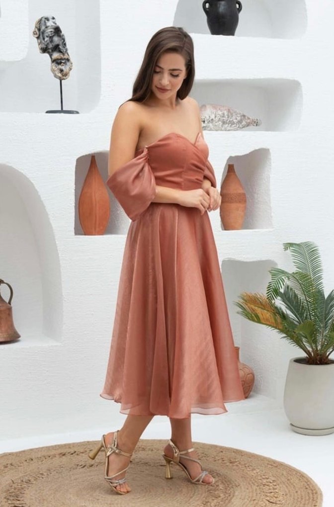 Straplez uzun elbise, parlak bakır renkli ipeksi kumaştan, drapeli ve askılı kollu, düğünler için şık ve çağdaş bir kesime sahiptir.