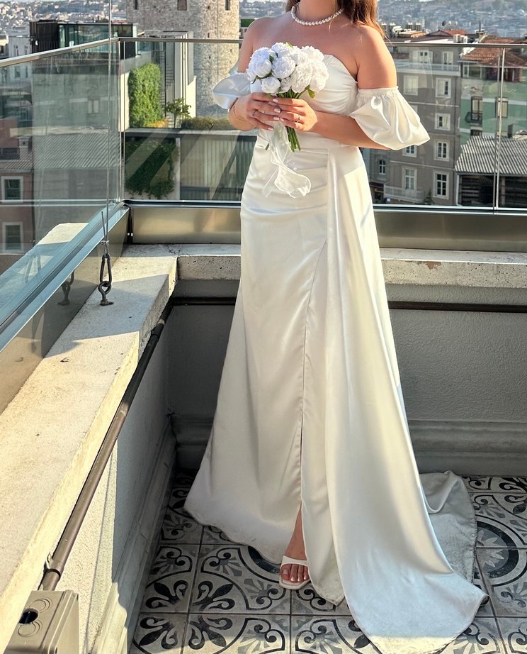 Bu dar kesim A kesim gelinlik, straplez yaka ve askılı kollara sahiptir. Uzun boyu ve yırtmaç detayıyla modern klasik tarzda, Paris esintili şık bir gelinliktir. Kiralama fiyatı