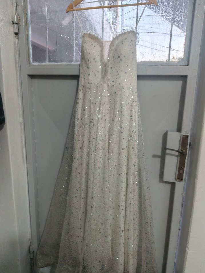Straplez, uzun boylu, vücuda oturan A-line gelinlik, parıltılı detaylarla göz alıcı ve şık bir tasarıma sahip. Nikah ve düğünlerde tercih edilebilir. satılık fiyatıdır.