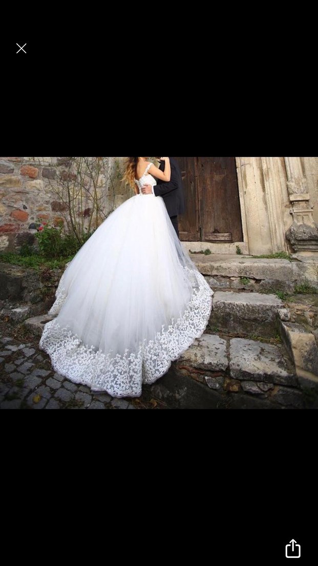 Straplez yakalı, askılı kolları olan, uzun beyaz eteği dantel detaylı, klasik ve gotik tarzı birleştiren prenses gelinlik.