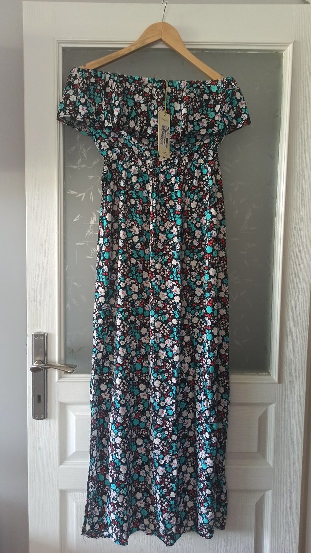 Bu straplez uzun elbise, kısa kollu ve bol kesimdir. Drapeli tasarımı ve koyu renkli çok renkli çiçek desenine sahiptir. Yumuşak sentetik kumaştan yapılmıştır. etiketlidir S-m uygundur ve ceplidir