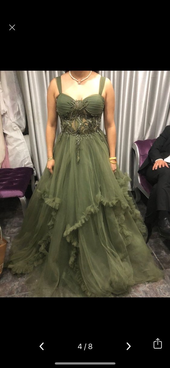 Bedeni 38 ama bolluğu vardı. Arkası ip bağcık model olduğu için 40-42 bedene kadar uyumlu olur. haki renkte, straplez, bel kısmı transparan,imce tül askılı uzun nişan elbisesi. İnce detaylı desenleri ve bohem tarzı ile klasik şıklık sunar.