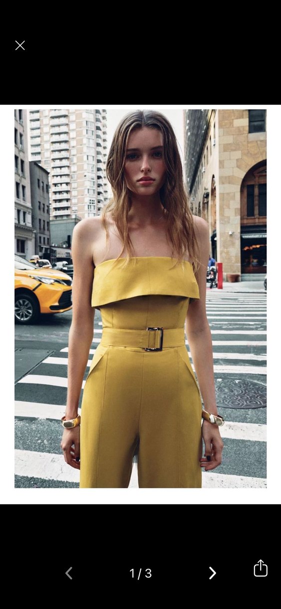 Hardal renk, straplez yaka ve tokalı kemer detaylı, uzun, regular fit kadın tulum. Sokak stili ve günlük kullanım için uygun, parlak ve desensiz kumaştan.
