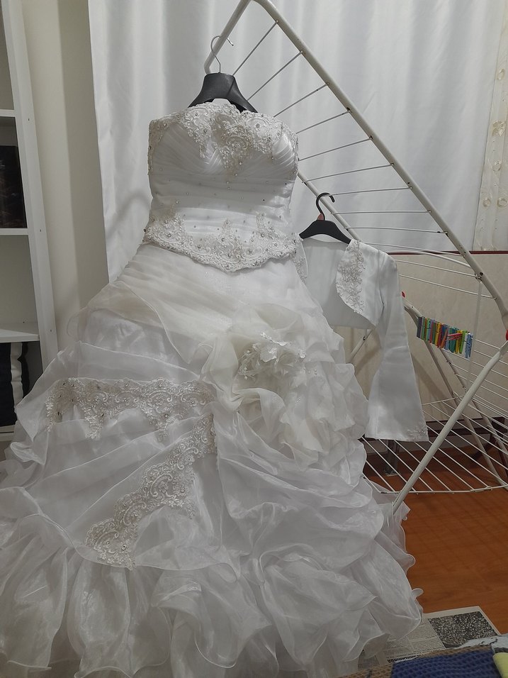 Beyaz prenses gelinlik, straplez ve dantelli detaylı dar kesim üst kısmı ile uzun, kat kat fırfırlı etekten oluşur. Strappy kollu ve vintage tarzı bolero ceket içerir.