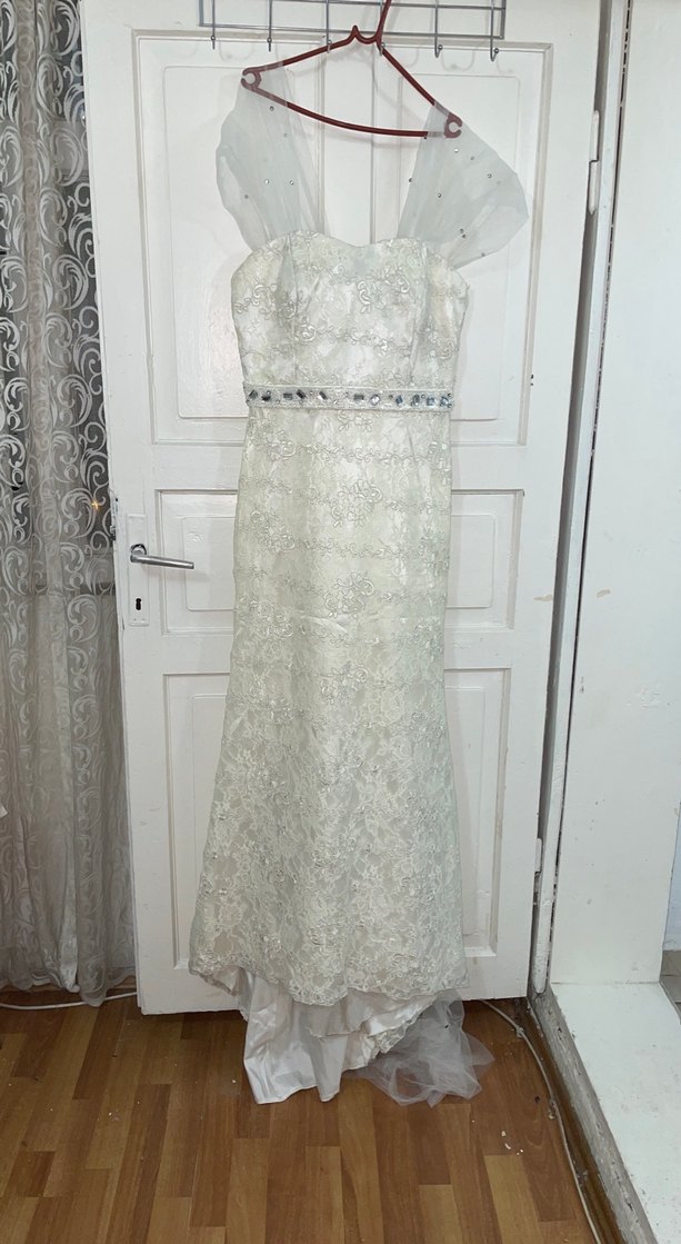 Straplez yaka ve kolsuz tasarıma sahip, vücuda oturan A-line gelinlik. Klasik zarafeti vintage dantel detayları ve hafif gri tonuyla birleştirir. Uzunluğu 1.55 cm
