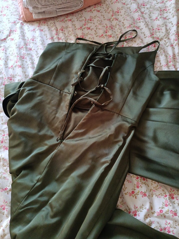 Satenimsi kumaştan, fit kesim, straplı ve uzun kollu, drapeli haki hamile tulum. Vintage goth tarzıyla romantik akşamlar için uygun.
