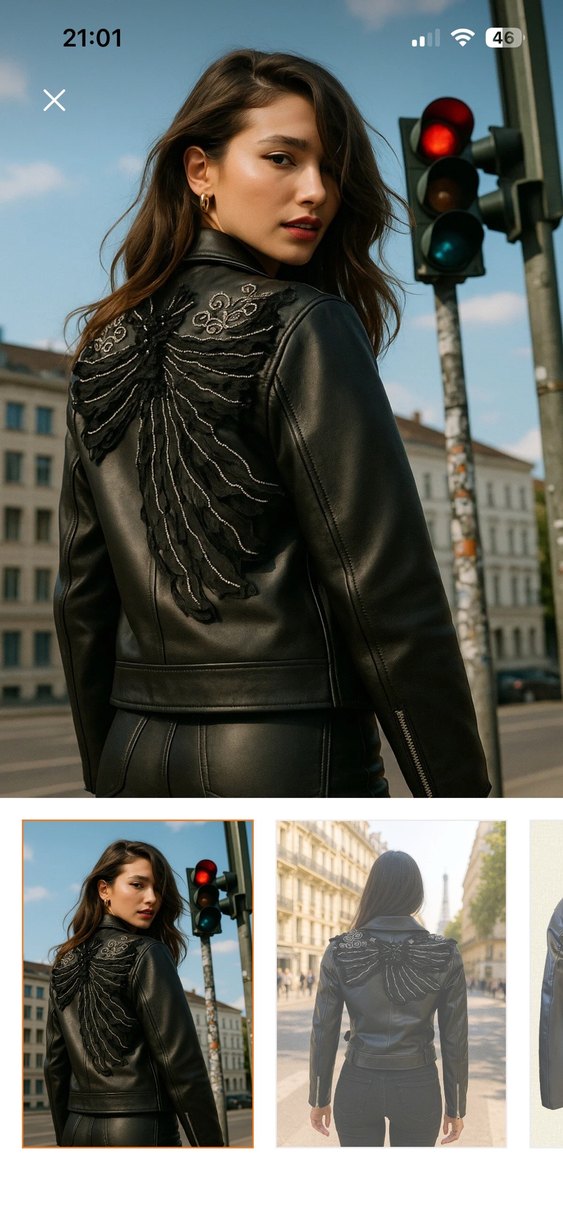 Fitted kesim siyah deri biker ceket, yüksek yakalı ve strappy kollu, sırtında kürk detaylı nakışlı desenlere sahip. Günlük kullanıma uygun koyu gotik tarzı sunar.