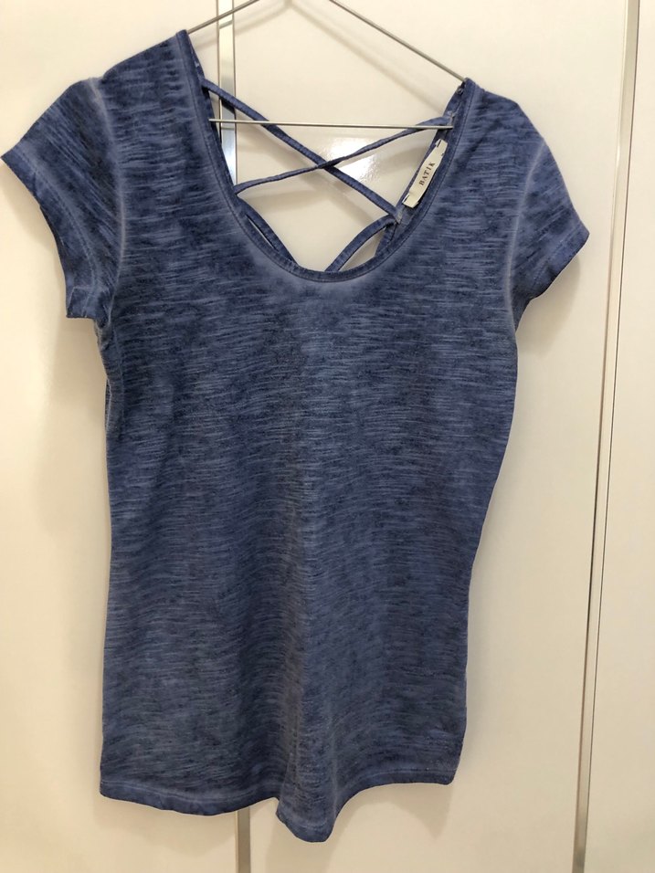 Mavi denim, V yaka ve sırtı çapraz askılı, gri batik desenli dar kesim tişört. Günlük sokak stiline uygun.