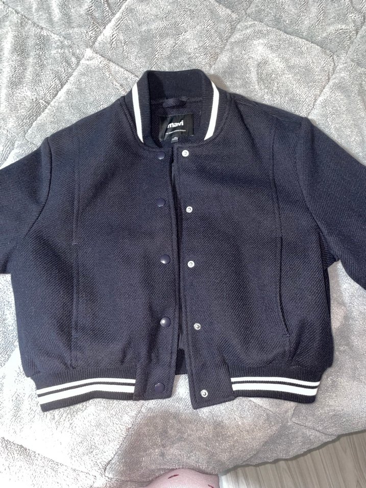 Düğmeli ve uzun kollu, yumuşak ve sıcak kumaştan yapılmış, lacivert renkli, normal midi boyda, casual streetwear tarzında kadın ceketi. 2 kez giyildi 0 ayarındadır hiçbir sorunu yoktur