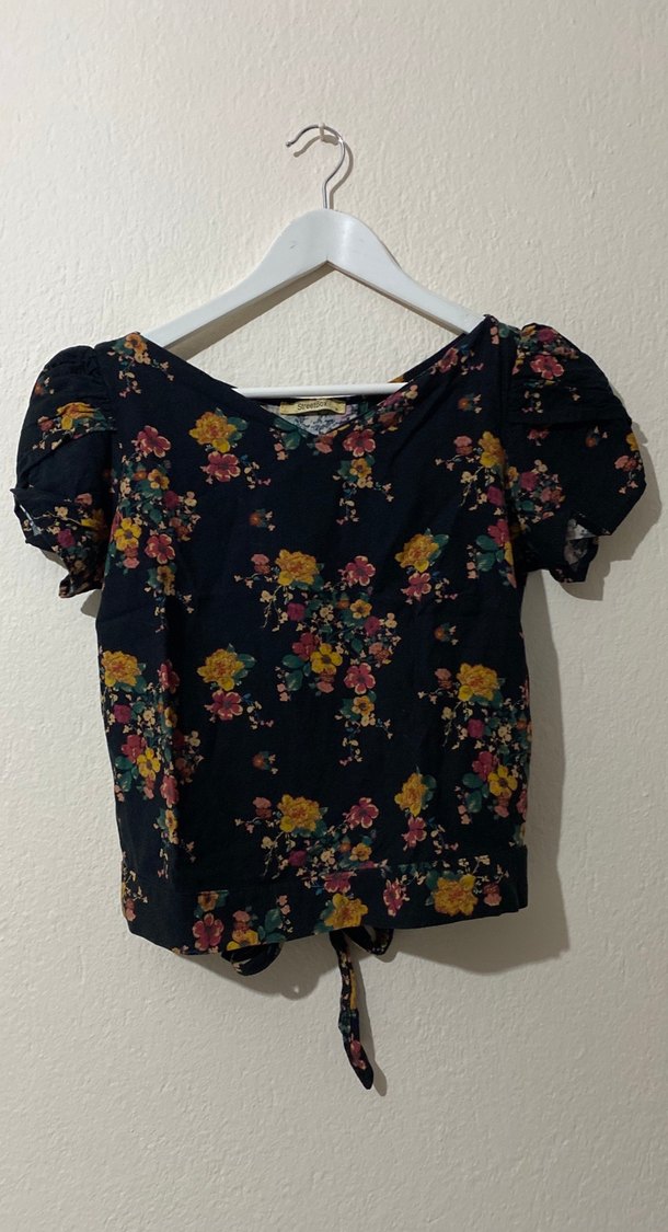 Koyu zemin üzerine çiçek desenli, V yakalı, düğmeli ve bağcık detaylı bohem tarz kısa kollu bol kesim bluz. Yumuşak sentetik kumaştan yapılmıştır.