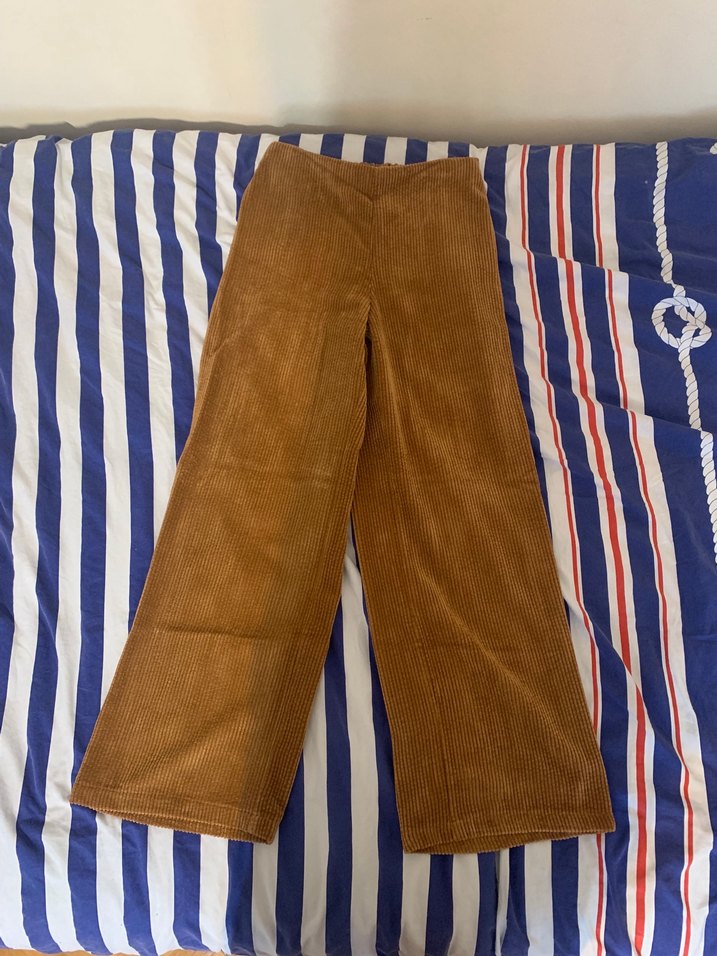 Kahverengi süet kumaştan, bol kesim ve piliseli tasarıma sahip, rahat ve retro sokak stili pantolon. Midi boy ve desensizdir.
