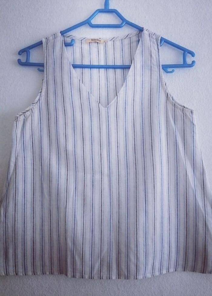 M beden cizgili 0 pamuk çan kesim V yaka bluz. Boy:57 cm, göğüs:43 cm, alt genişlik(çan kısım) : 62 cm