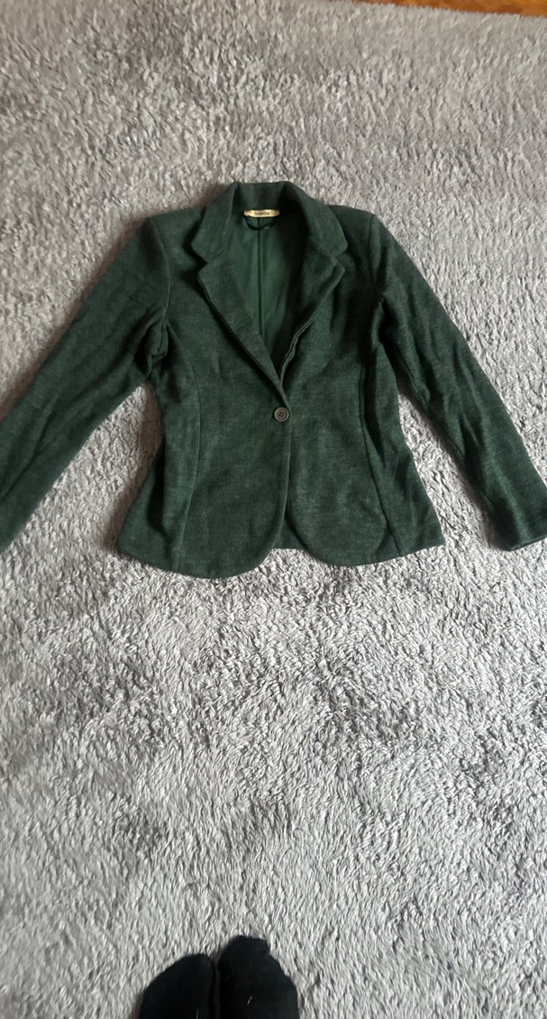Düğmeli, yeşil kadın blazer ceket, yumuşak ve sıcak kumaştan, uzun kollu ve dar kesim.içi astarsız bir kez giyildi hiç bir sorunu yoktur