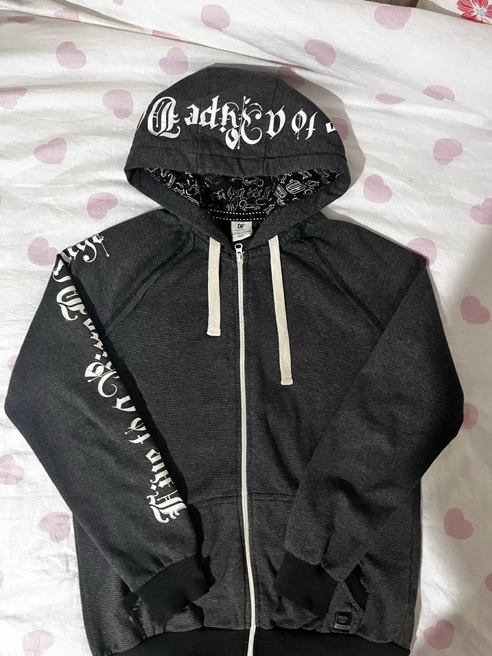 Gri renk, kapüşonlu ve fermuarlı bu sweatshirt, uzun kollu ve bol kesimdir. Gotik yazı baskılarıyla sıcak ve yumuşak kumaştan üretilmiştir.