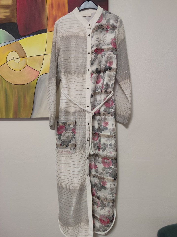 Gri uzun kollu, düğmeli, kemerli ve bol kesim bohem tarzında, tie-dye ve çiçek desenli ön kısmına astar dikildi