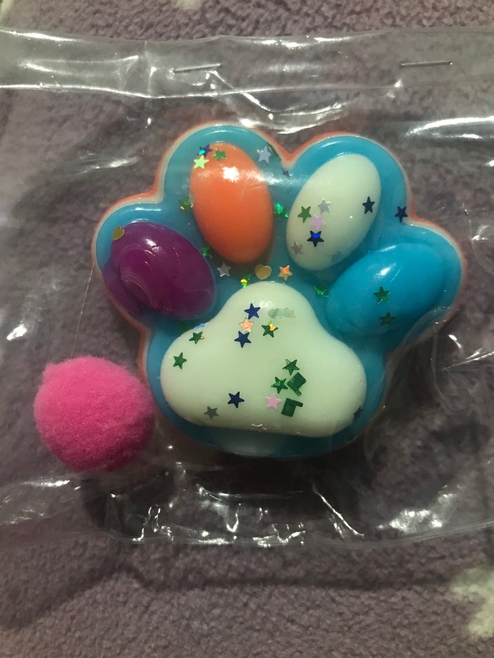 Çok renkli kedi pençesi şeklinde oyuncak, çeşitli canlı renkler ve küçük pembe ponpon içerir. Yumuşak