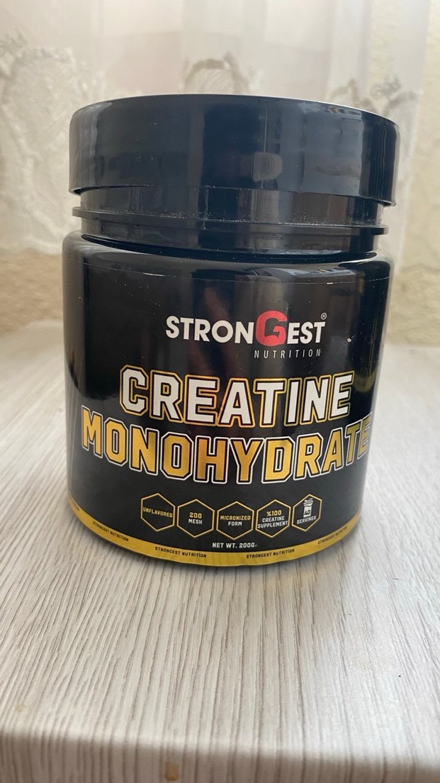 Parlak siyah ambalajda Strongest markasına ait 200g kreatin monohidrat tozu, kas gücünü destekler.hiç kullanmadım sadece ambalajı açık