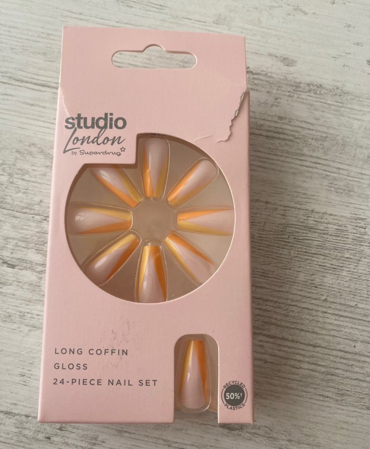 Studio London tarafından sunulan, pastel bej parlak renkte, uzun tabut şekilli 24 parçalı tırnak seti. Şık ve doğal görünüm sağlar.