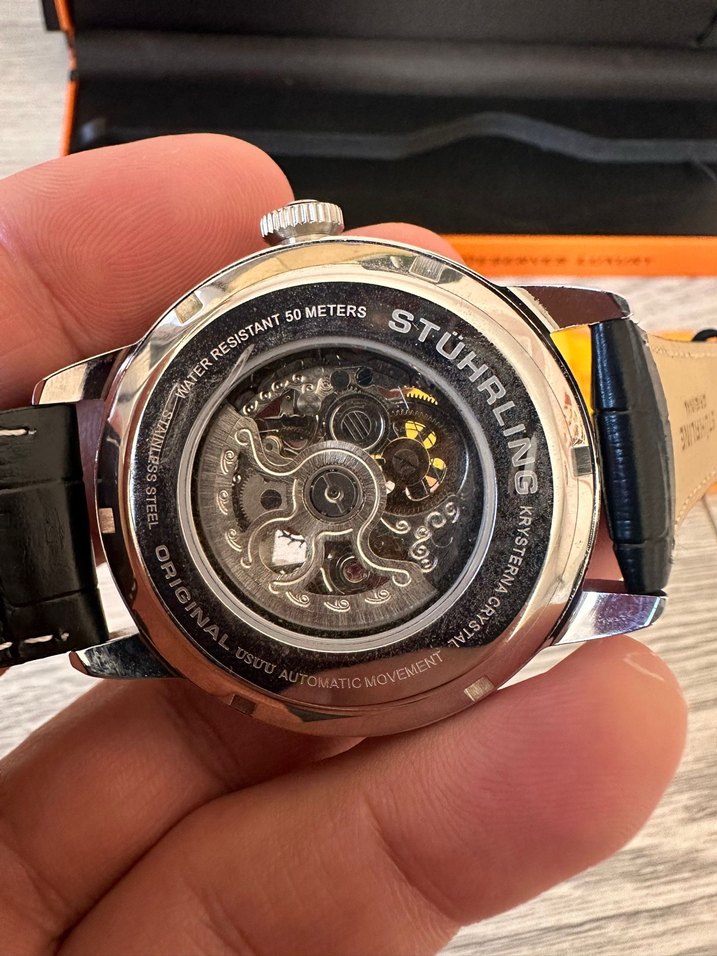 Orijinal Otomatik Stührling, Çok kullanılmadı sadece bazı özel günlerde. Skeleton saat hastaları için özel bir seri, dişlilerinin sesini duymanın yanında saniye kadranının hareket ettiğine de şahit olabilirsiniz. Saatimizin garanti süresi dolmuştur faturasıda maalesef kayıp durumda , yıllar önce Amerika ziyaretim esnasında almıştım. Kutusu ve resimlerde gördüğünüz aksesuarlarla gönderim sağlanacaktır. Alan kişi uzun yıllar kullanacaktır.